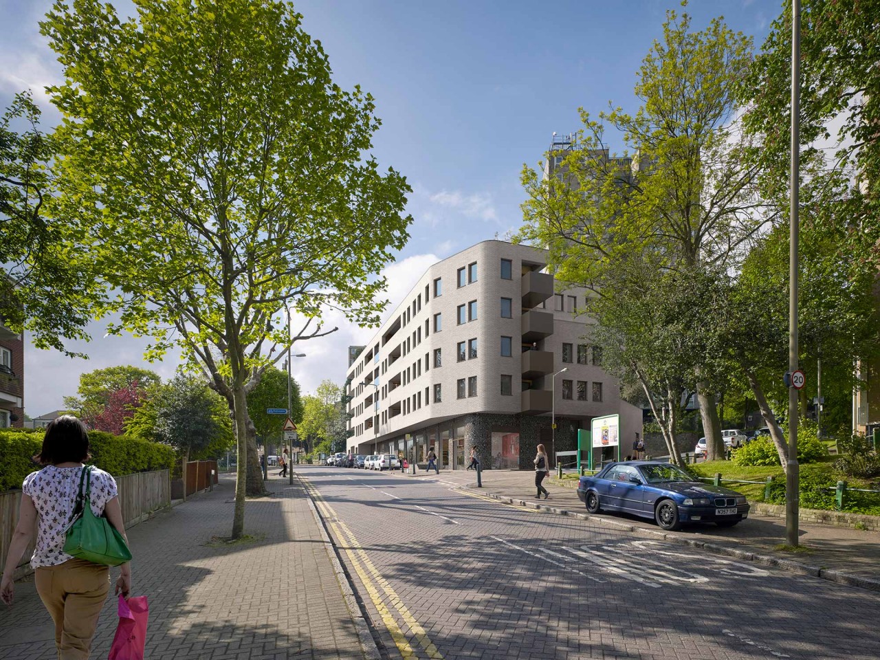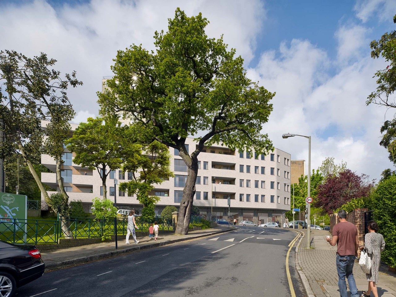 The photomontages convey the potential for the project in the regeneration of the local area. Eye-kon was asked to insert the project into the broader urban context, highlighting external finishes, flint and ground floor and white brick above.